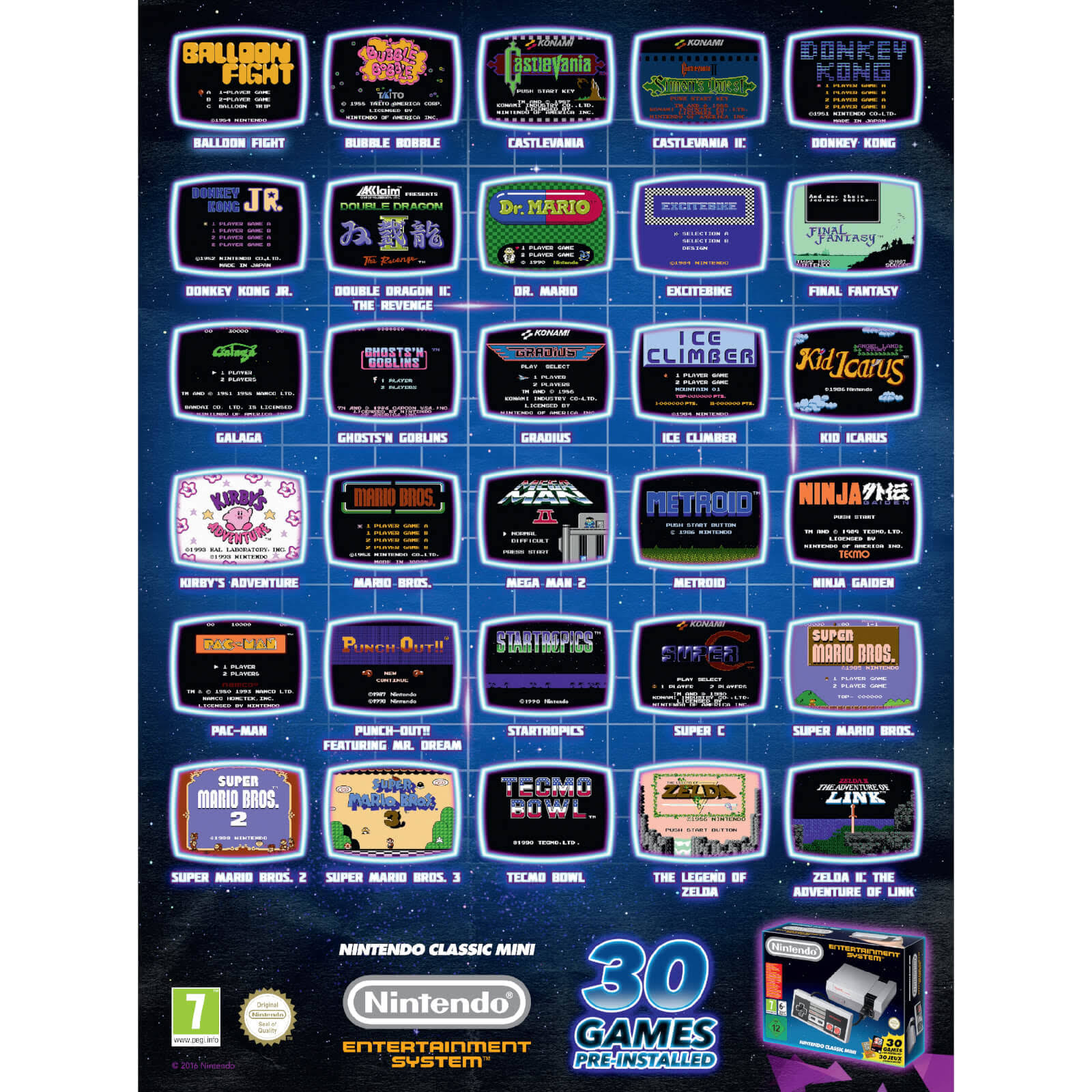 is one of the largest producers of video games. For over three decades, they have wowed us with series of great titles. If you are a fan of retro games, you will be quite pleased with what the Mini Classic has in store. Old Games with a New Twist The console offers a number of built in games to choose from. As should be expected, the developers at have brought back some of their all-time greatest titles within a single platform. Some examples of games built in including Kirbys Adventure are Mega Man 2, the undeniably amazing Zelda and Super Mario. These games can be accessed with the click of a button. They have stayed completely true to their 16-bit history, so that children of the 1980s will be provided with a trip down memory lane. Having said this, the dimensions of the controllers have remained the same. Setting up the unit is pretty straightforward. The only additional piece of hardware that is required is a standard AC cable (such as a smartphone charger). The unit is complete with 30 NES games and has already attracted a considerable amount of attention.